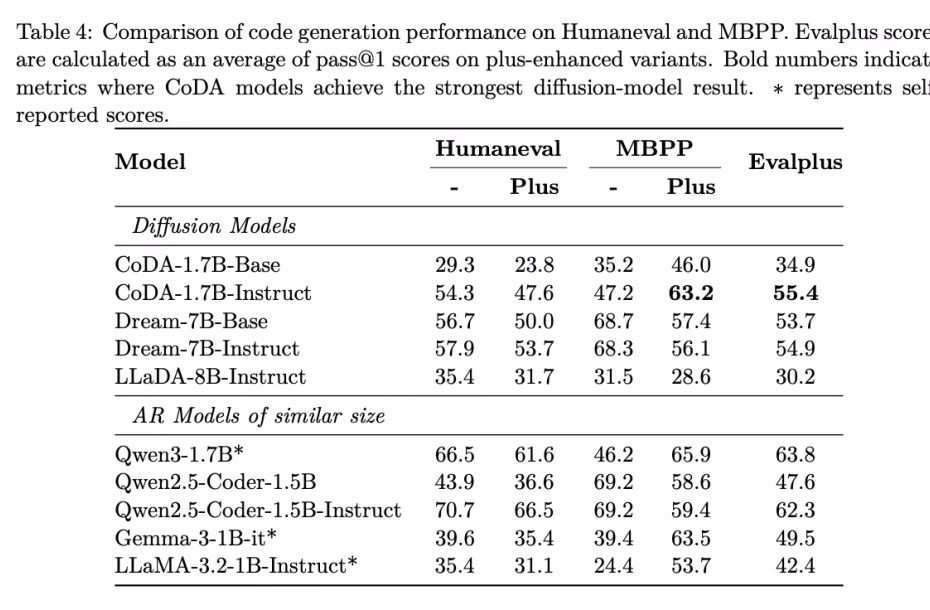 On standard code-gen suites, CoDA-1.7B-Instruct reports: HumanEval 54.3%, HumanEval+ 47.6%, MBPP 47.2%, MBPP+ 63.2%, EvalPlus aggregate 55.4% (pass@1). For context, the model card compares against diffusion baselines including Dream-7B-Instruct (57.9% HumanEval), indicating CoDA’s 1.7B footprint is competitive with some 7B diffusion models on several metrics while using fewer parameters.
