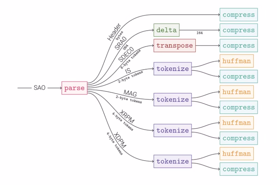 OpenZL makes format-aware compression operationally practical: compressors are expressed as DAGs, embedded as a self-describing graph in each frame, and decoded by a universal decoder, eliminating reader rollouts. Overall, OpenZL encodes a codec DAG in each frame and decodes via a universal reader; Meta reports Pareto gains over zstd/xz on real datasets.