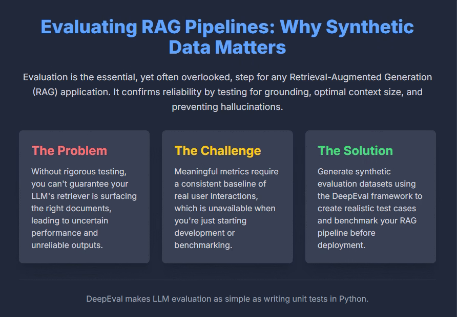 Since initial testing lacks the necessary real user data for a baseline, a practical solution is synthetic evaluation datasets. This article will show you how to generate these realistic test cases using DeepEval, an open-source framework that simplifies LLM evaluation, allowing you to benchmark your RAG pipeline before it goes live. Check out the FULL CODES here.